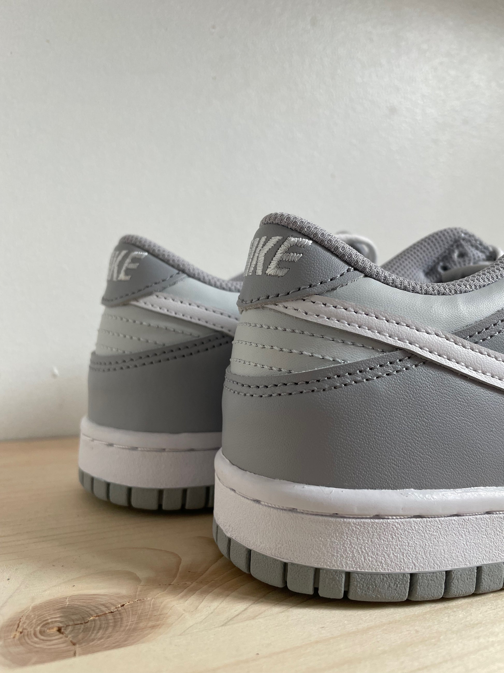 Een lichtgrijs leren bovenwerk, donkergrijze overlays en witte swooshes om het af te maken.